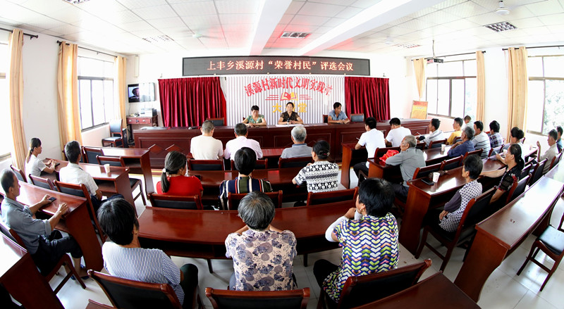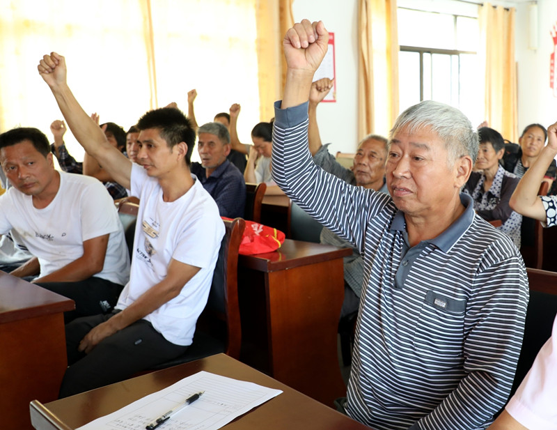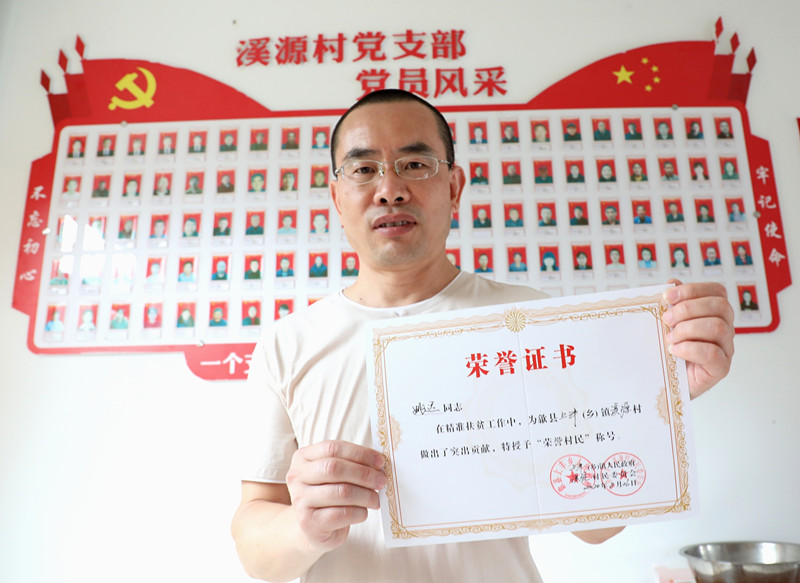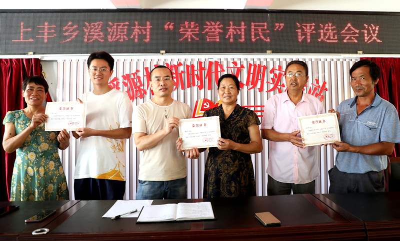 8月26日,安徽黃山市歙縣上豐鄉溪源村召開“榮譽村民”評選會議,扶貧隊長姚遲(左三)、副隊長汪家順(右二)和扶貧專幹王鴻之(左二)全票通過當選“榮譽村民”。
