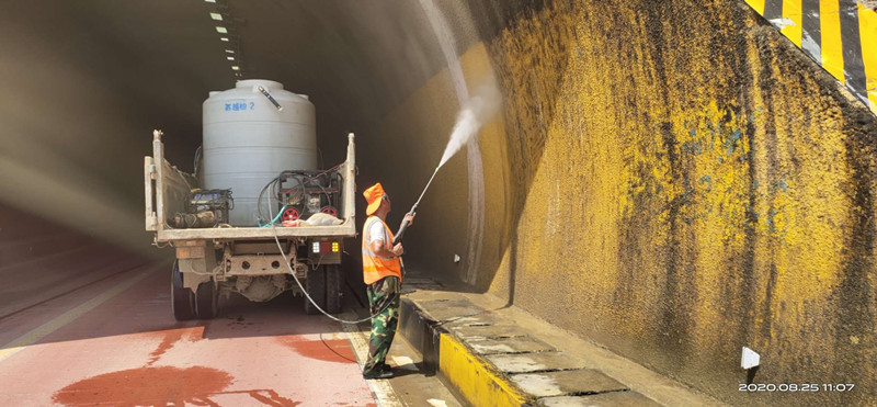 近期,因雨水較多往來車輛通過隧道時帶入大量泥水和粉塵,乾燥後的粉塵大量彌漫在隧道內久散不去,特別是興嶺隧道出口段因暴雨造成泥石流,嚴重影響隧道排水設施,不僅影響通行,還給交通帶來了安全隱患。此次清洗,分中心利用高壓水槍對隧道內26916m2防火塗料、10204 m2路面進行了徹底清洗,並疏通了隧道中心排水管1379延米、排水溝2758延米,更換電纜槽蓋板150塊。同時聘請專業電力維修人員對隧道內的所有電路進行了檢修,修復故障照明燈具84盞、輪廓燈78盞、更換控制箱盒7處。