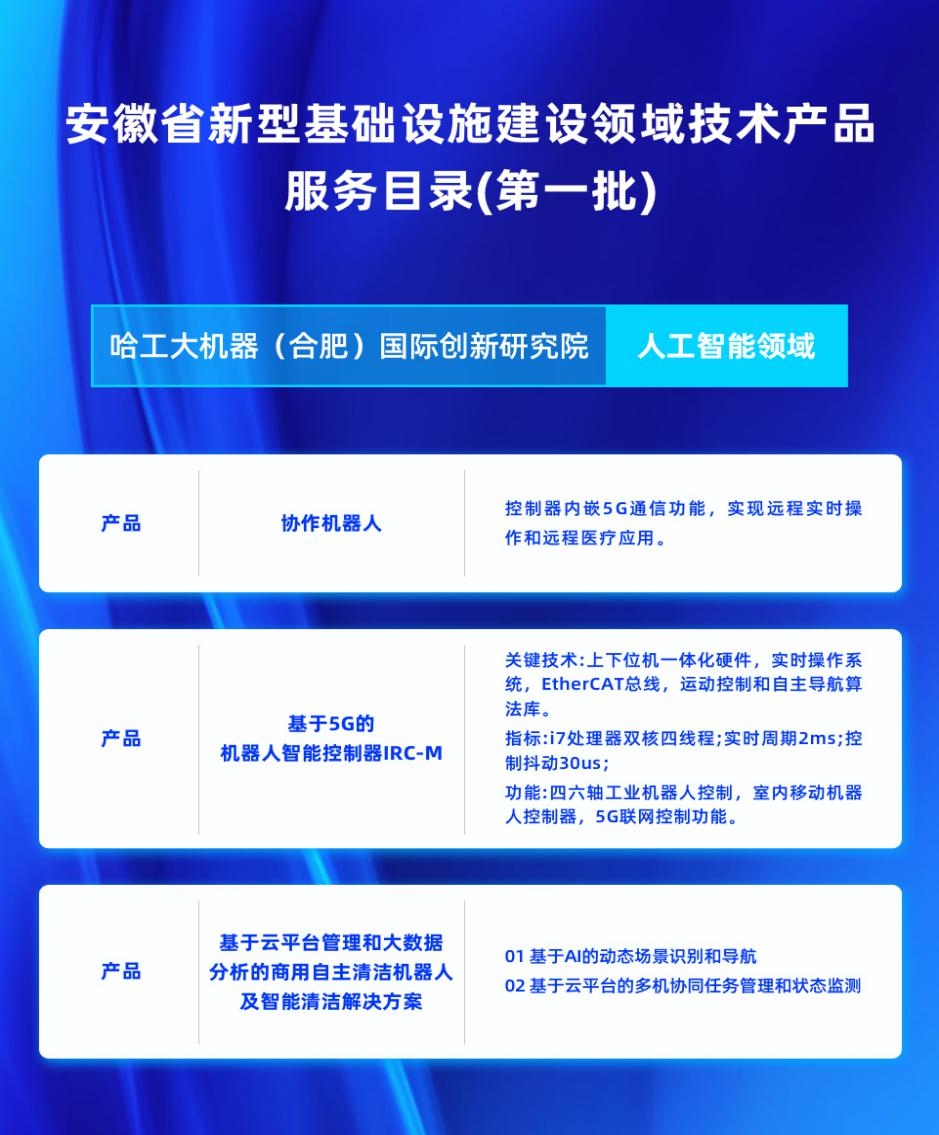 【香港商報網訊】近期,安徽省正式發佈全國首個新基建領域技術產品服務目錄。作為安徽省機械人、人工智能與工業互聯網領域的科技創新「名片」,由國家級合肥經濟技術開發區與哈工大機械人集團(HRG)攜手共建的哈工大機械人(合肥)基地(以下簡稱:HRG合肥基地),共有13項解決方案入列該服務目錄。