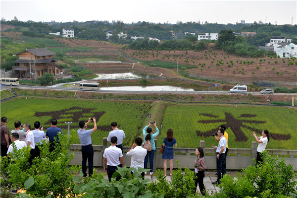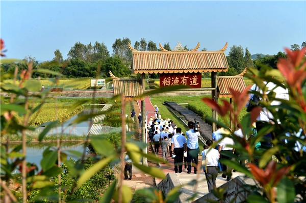 與會嘉賓在隆昌市普潤鎮印壩村星光稻漁果立體種養基地參觀考察【王斌 攝】