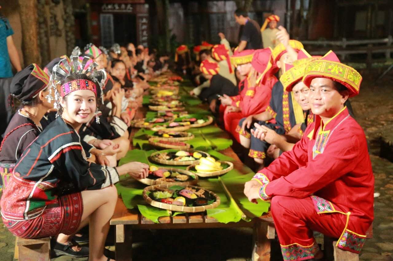 黎苗美食,源远流长。图为黎家特色长桌宴。(槟榔谷景区 供图)