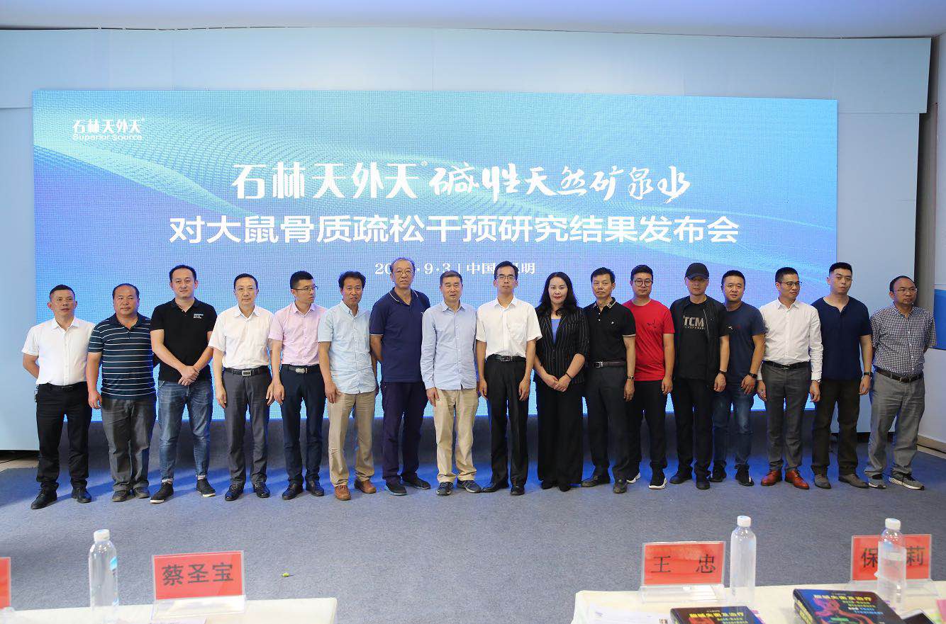 會上,昆明理工大學農業與食品學院蔡聖寶博士作為研究主理人公佈了研究結果。實驗將12隻大鼠隨機分成兩組,利用維甲酸誘導大鼠形成骨質疏鬆模型,在誘導過程中,兩組大鼠餵養相同的維持飼料和不同的水。一組餵養pH9.3的石林天外天鹼性天然礦泉水,另一組餵養pH6.0的純淨水,30天後對比兩種水對大鼠骨質疏鬆的影響。
