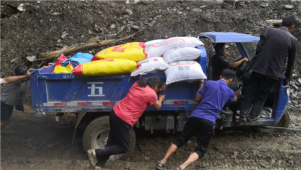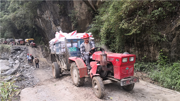 「大家再加把勁、一起使勁推,嘿喲、嘿喲…」一聲聲使勁的號子聲響了起來。「謝大哥,你車子往裡面靠點,注意安全,後面車子不要急,一輛一輛的過…」一陣陣指的吆喝聲響了起來。「騰騰騰、騰騰騰…」一股股拖拉機的轟鳴聲響了起來。在北川小壩鎮太白溝金大路上,七八輛拖拉機正拉著飼料往村里走。原來這是太白村的蔡勇、李勇等生豬養殖戶,在因災受損的道路剛剛恢復通行,就聯合組織了拖拉機車隊到鎮上拉飼料。