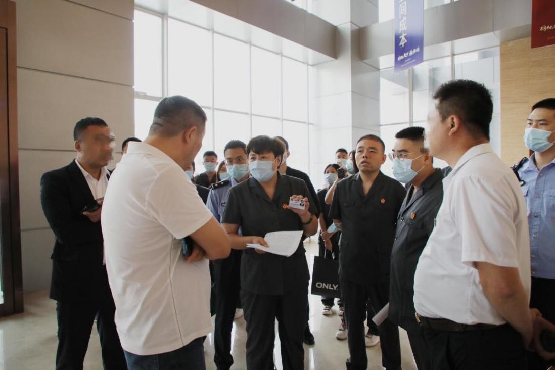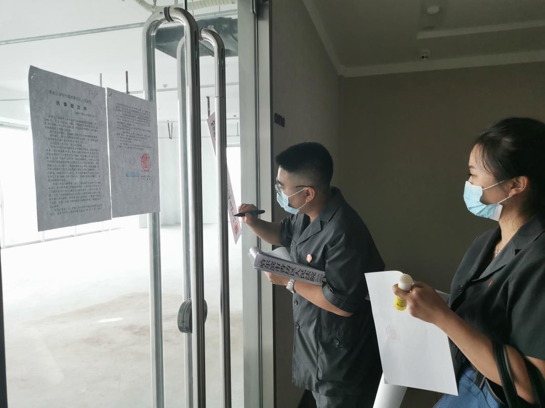 9月5日(星期六),院執行局副局長王濤帶領20餘名執行幹警奔赴位於香坊區紅旗大街的一處寫字樓,分四個工作組對分處在21個樓層的134間房產進行預查封(另18間房產因在使用中,故申請人申請僅對其房產檔案進行預查封),依次張貼裁定書、封條,並在相應樓層張貼了預查封財產清單和公告。歷時兩個小時,保全查封工作全部完成。