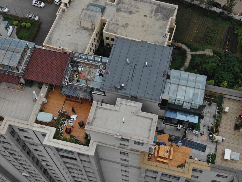 記者在拆除現場,看到違建房屋位於該小區高層住宅的32樓的房屋平台上,從地面抬頭幾乎看不到違建房屋,隱蔽性很高。通過現場執法人員施放的無人機返回圖像,記者看到各種違建房屋星羅棋佈的佔滿了樓頂公共空間,有的業戶甚至蓋成了兩層別墅,安裝了木質連廊、休閒椅等設施,種上了花草,儼然成了自家的「室外桃園」。由於違建房屋位於32層平台頂上,無法使用大型機械進行施工拆除,因此,此次樓頂違建房屋將全部由工人手動拆除,拆除的建築垃圾也將由人工清運。