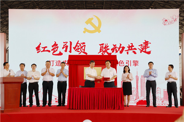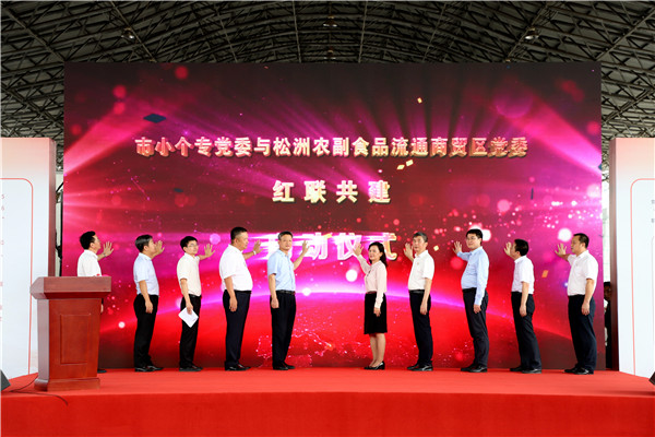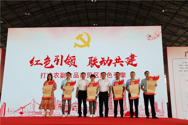 推進會上,松洲農副食品流通商貿區黨委正式揭牌並舉行「紅聯共建」啟動儀式,雙方簽訂共建協議,並向6名黨員商戶代表授牌。共建雙方將以「黨組織共建、陣地共享、活動共辦、黨員共訓、難題共解、合作共贏」的模式,建設黨建新陣地,強化組織建設,開展「亮身份、促誠信」活動,推動商貿區「雙循環」高質量發展,打造廣州市黨建品牌。