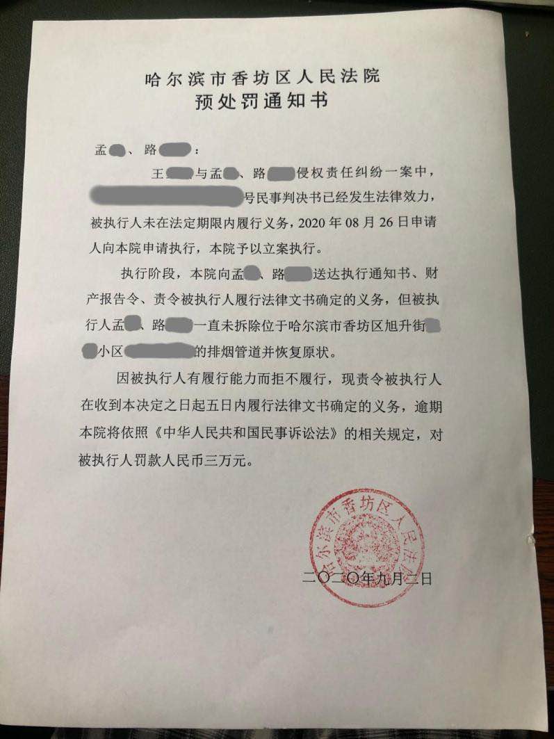 9月2日,執行法官曹連征前往執行地點,向二被執行人送達了預處罰通知書,告知其有履行能力而拒不履行所要承擔的法律後果,二被執行人當場以各種理由表示無法立即拆除。與此同時,申請人王某則強烈要求法院立即強制拆除排煙管道,恢復原狀。雙方當事人情緒均較為激動。
