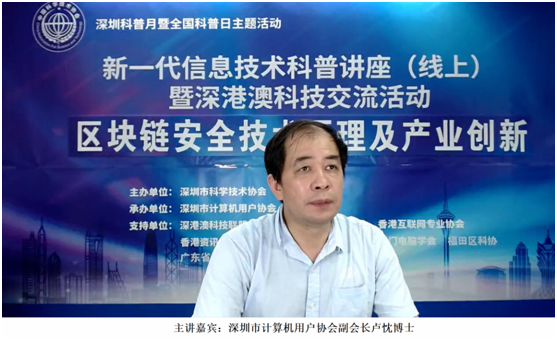 【香港商報網訊】9月10日晚,由深圳市科協主辦、深圳市計算機用戶協會承辦的深圳科普月暨全國科普日主題活動第二場直播如期舉行。此間,深圳市計算機用戶協會副會長、教授級高工盧忱博士作主題為《區塊鏈安全技術原理及產業創新》的講座。盧博士輕鬆、詼諧、深入淺出的講述讓大家對區塊鏈關鍵技術有所了解,同時對於未來區塊鏈應用加深了認識。