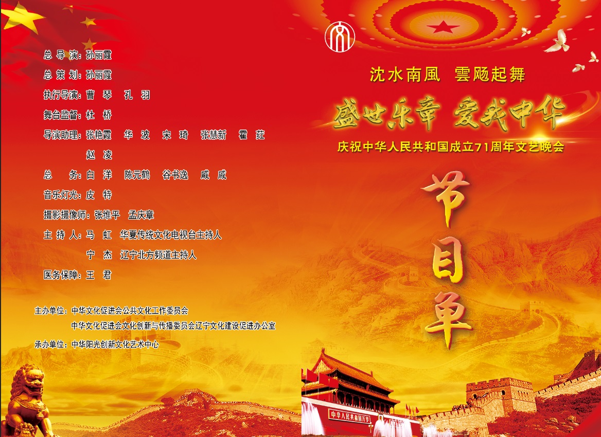 【香港商報網訊】由中華文化促進會公共文化工作委員會、中華文化促進會文化創新與傳播委員會遼寧文化促進辦公室主辦、中華陽光創新文化藝術中心承辦的《慶祝中華人民共和國成立71周年文藝晚會》9月13日在美麗的沈城音樂名片——瀋水灣雲颺閣盛大舉行。