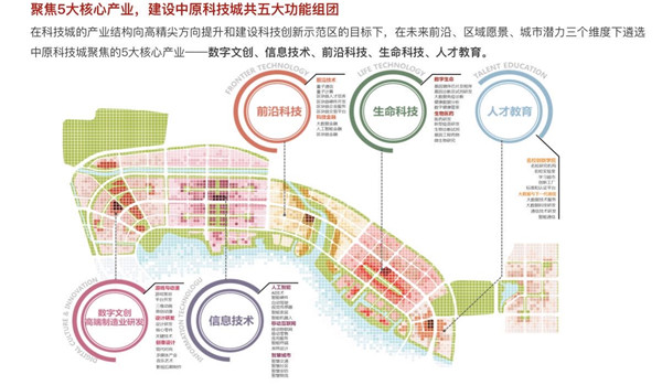 在產業發展上,中原科技城立足數字文創、信息技術、前沿科技、生命科技、人才教育五大核心產業,建設五大功能組團,即數字文創產業、信息技術產業、前沿科技產業、生命科技產業和名校創新學院,打造空間與產業、生活與環境相融合的新型產業之城。