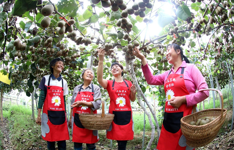 【香港商報網訊】9月16日,安徽歙縣森村鄉紹村三紅果業女子專業合作社負責人淩雪萍(右二)與社員在採摘紅陽紅心獼猴桃。