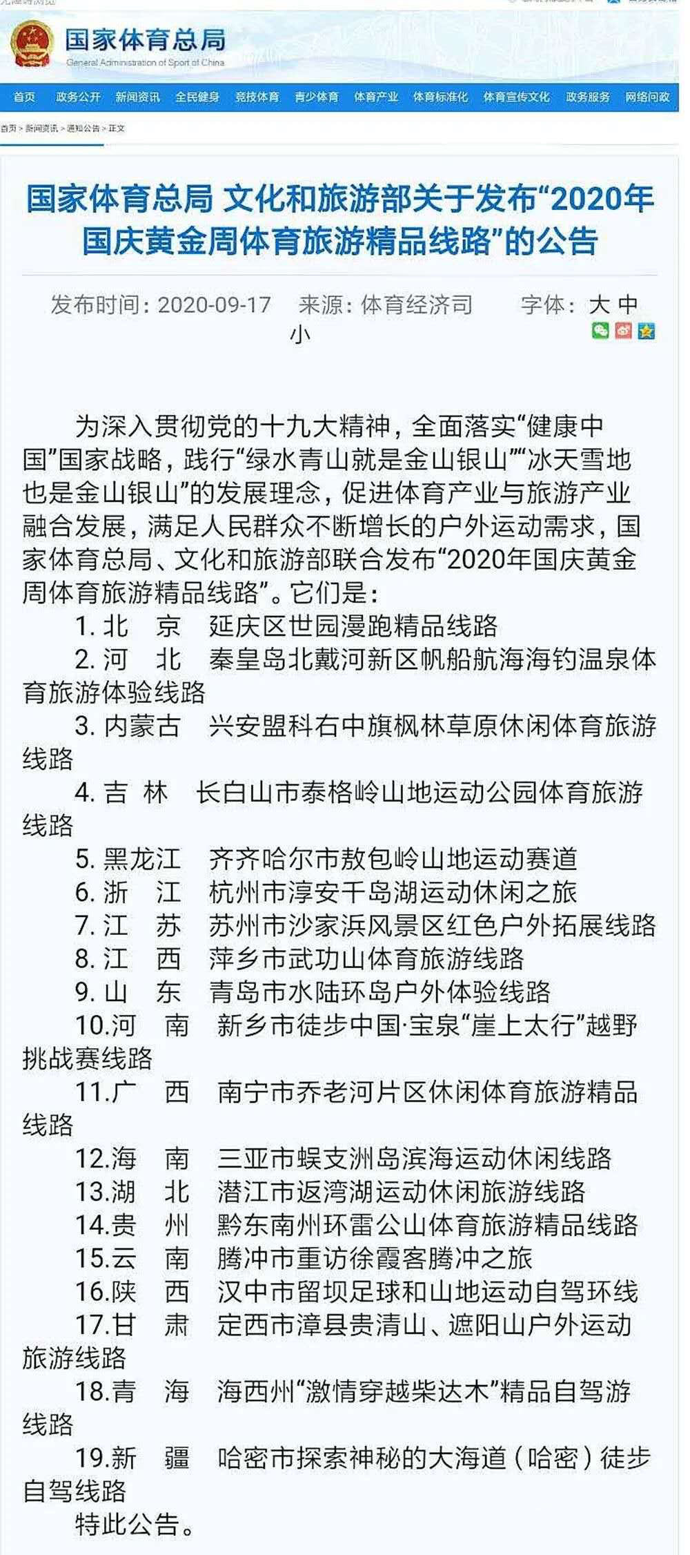 【香港商報網訊】9月17日,國家體育總局、文化和旅遊部聯合發佈「2020年國慶黃金周體育旅遊精品線路」,全國各地共有19條線路入選,黑龍江省齊齊哈爾市碾子山區敖包嶺山地運動賽道成為黑龍江省唯一入選的體育旅遊精品線路。