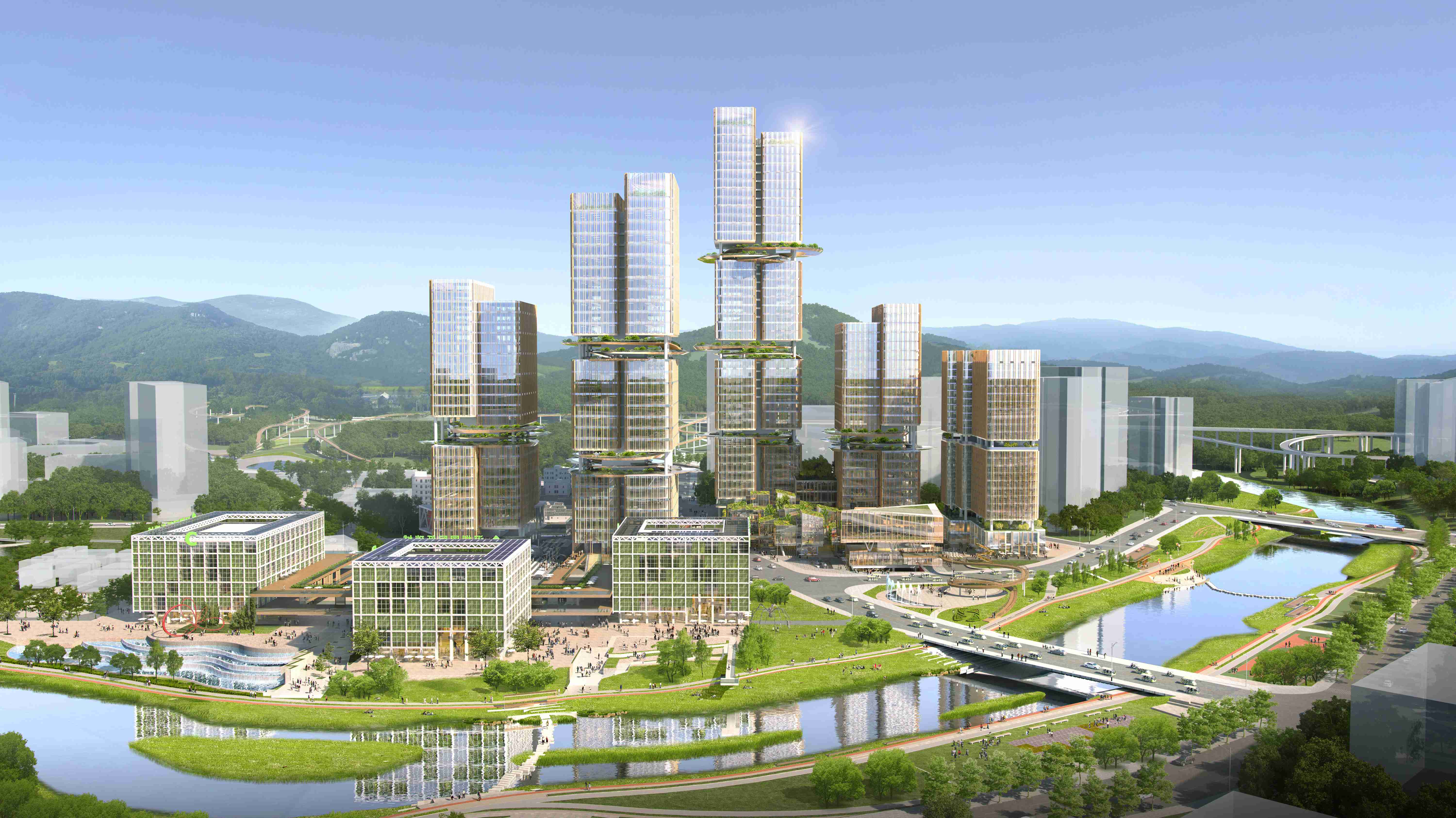 「整個項目以低碳活力軸為統領,在設計上順應氣候特點,結合夏季主導風形成梳式佈局,最大限度利用自然氣候條件進行通風除濕。吸收傳統圍屋的微氣候調節佈局,結合場地綠地空間和屋頂花園、山體、河流形成微氣候循環。」張海波說,「我們還特別強調智慧內核的綠色低碳技術應用,以低衝擊開發、海綿城市作為項目開發基礎,以大數據、AI、智慧城市等先進技術助力片區綠色低碳開發。」