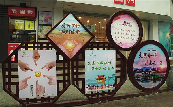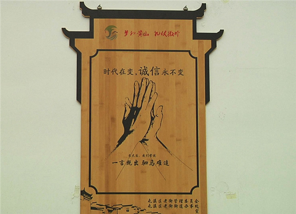 行走在屯溪老街,一幅幅木質、竹編設計的公益廣告成為了新的亮點,法制文化、志願文化和安全文化宣傳以百姓喜聞樂見的形式,展示著文明城市的“新風尚”。近期,老街街道結合轄區實際情況,增設了多處獨具特色的公益廣告,目前公益廣告總計145處。現在的屯溪老街,濃厚的公益廣告氛圍已逐步形成,向上的正能量正逐步傳遞。