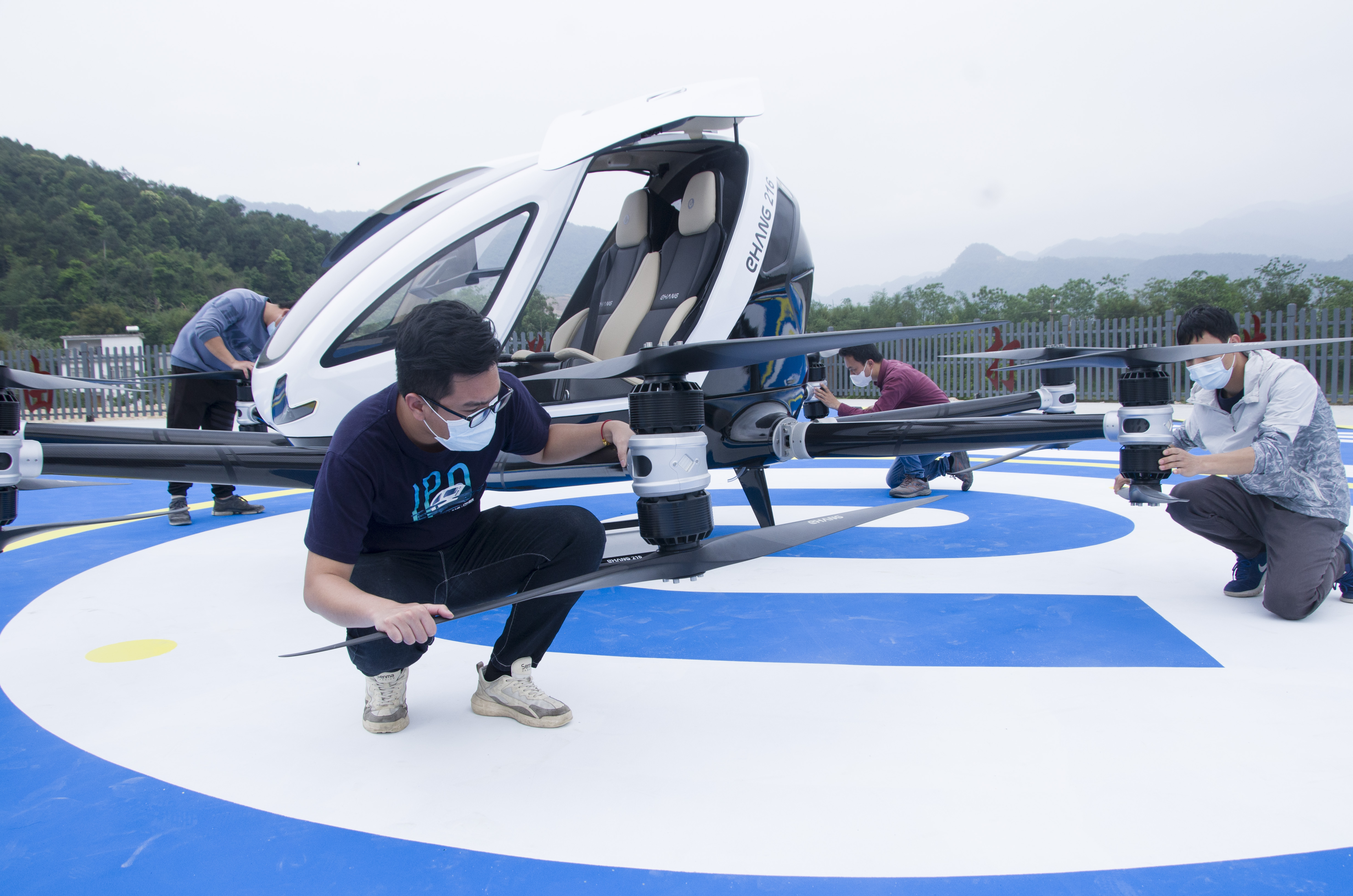 億航無人機總裝基地的技術人員正在對無人機進行起飛前檢查。賀州市委宣傳部供圖