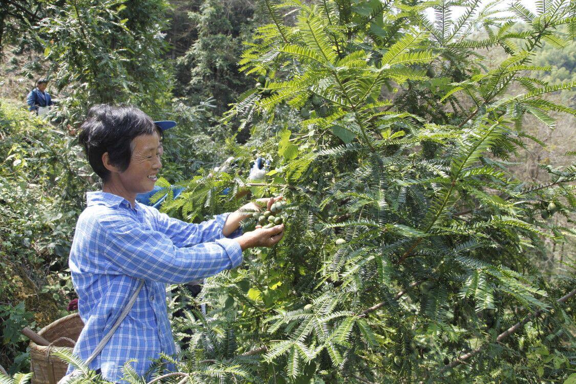 “2010年,第一批嫁接改良後的香榧樹開始零星掛果,欣喜的是品質上和諸暨香榧完全相同,當年15斤香榧共賣了2400元。”小容原生地香榧改良成功讓範建雨看到了發展前景,作為一名黨員,他想著要帶領群眾一起改良香榧共同致富。按照村黨支部“黨建引領、產業富民”的要求,小容村成立了香榧產業支部,通過“支部領航、幹部帶頭、黨員示範”帶動村民開展大規模的老香榧林改造,力促資源優勢轉換成效益優勢。通過無償傳授香榧嫁接技術,指導村民統一做好香榧林管理和保底價回收,小容自然村先後完成高位嫁接香榧林面積2100畝。