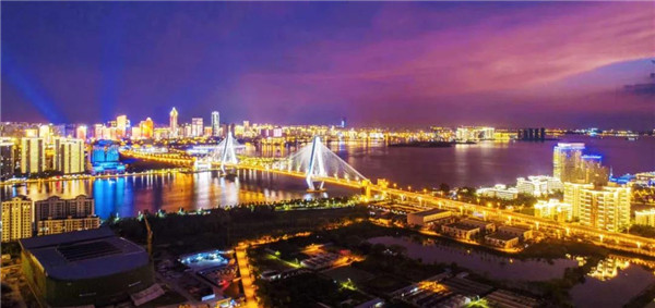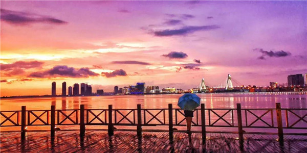 傍晚,一抹抹晚霞在世紀大橋映襯下,"落"在海口灣裏,勾勒出令人陶醉的椰城美景,霓虹閃爍,吟遊的歌者,步道上,打卡拍照的遊人,還有街頭藝人的熱鬧喧囂。