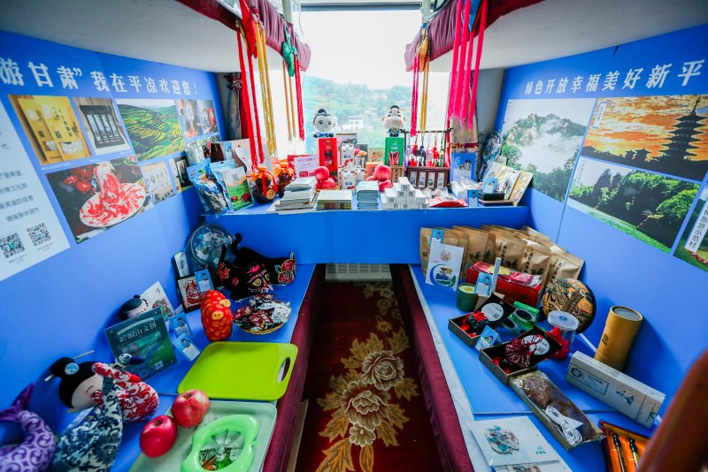 列車設有展示館13個,全方位展示甘肅14個市州和蘭州新區的文旅資源、扶貧產品、文創產品等。或一節車廂,或一個包廂,小天地,大世界,把甘肅各地最具代表性的歷史文化活化再現、好山好水濃縮展現、美食美味盛情奉獻。如大地灣彩陶、敦煌飛天等文創產品引人思飄千年;長城雄關、七彩丹霞等宣傳畫冊帶你一步萬里;蘭州、天水、慶陽、臨夏等地的香包、刺繡、葫蘆雕刻、虎娃抱枕等讓人回味鄉土、感念兒時;特別是嘉峪關的巨幅「綠水青山就是金山銀山」剪紙,遠觀是「兩山」理論喜慶大字,近看是祁連山下田園牧歌百景圖,使你對新時代農民肅然起敬。蘭州牛肉麵熱氣騰騰,平涼金果香脆可口,讓人一飽口福;崆峒道家的養生按摩,讓你驟減旅途勞頓;「火車老街」的品茶玩牌,帶你體驗人間煙火。