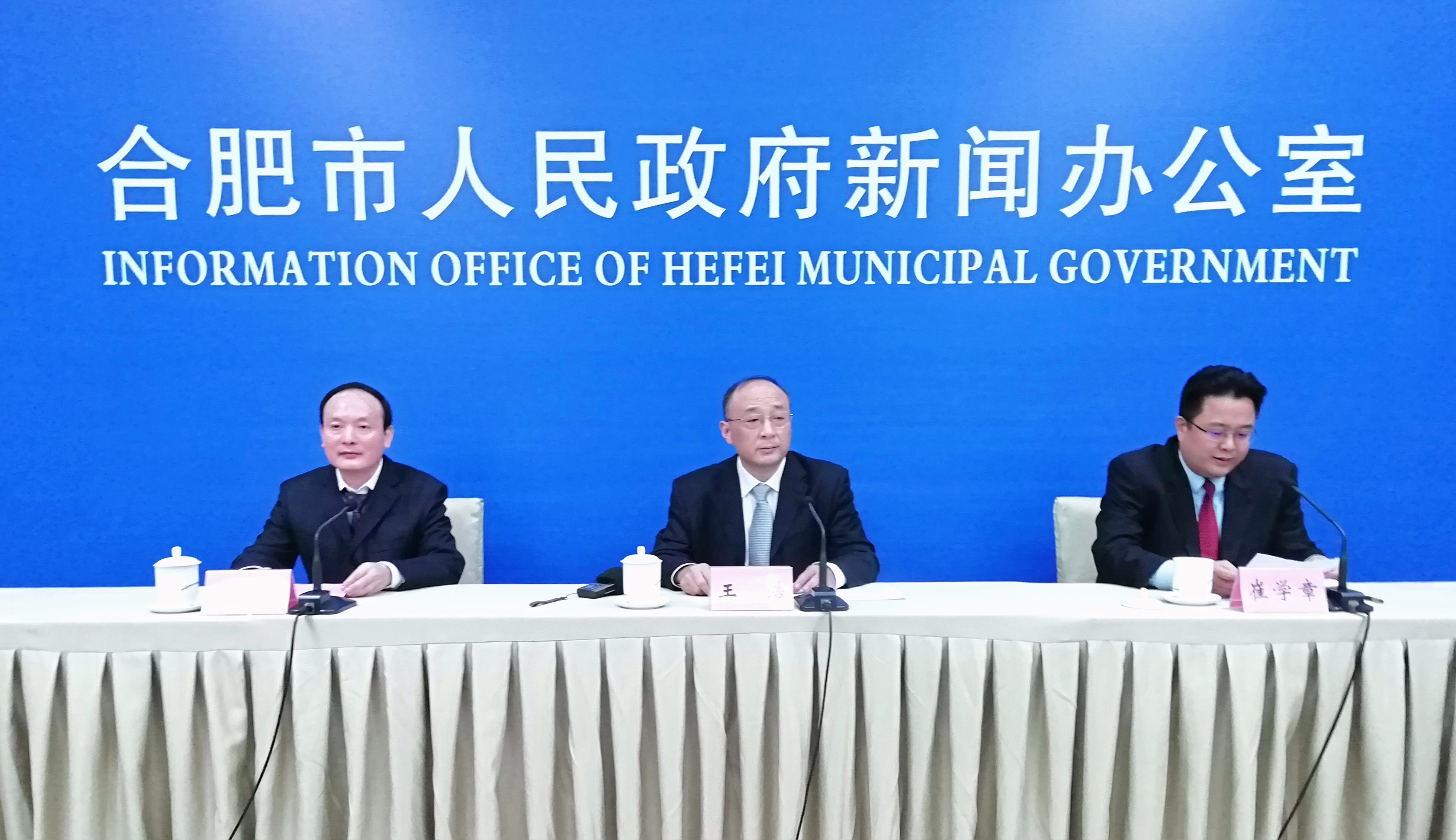 第十四屆合肥國際文化博覽會新聞發佈會現場。左起:安徽中設國際會展集團有限公司董事長楊傑,合肥市委宣傳部常務副部長王浩,市委宣傳部副部長崔學章主持發佈會(孫軍/攝)