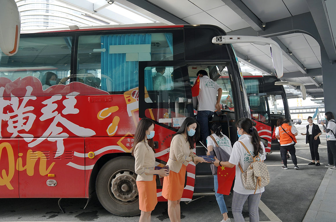 在橫琴口岸服務的「好玩橫琴」公交旅遊巴士。(吳俊均攝)