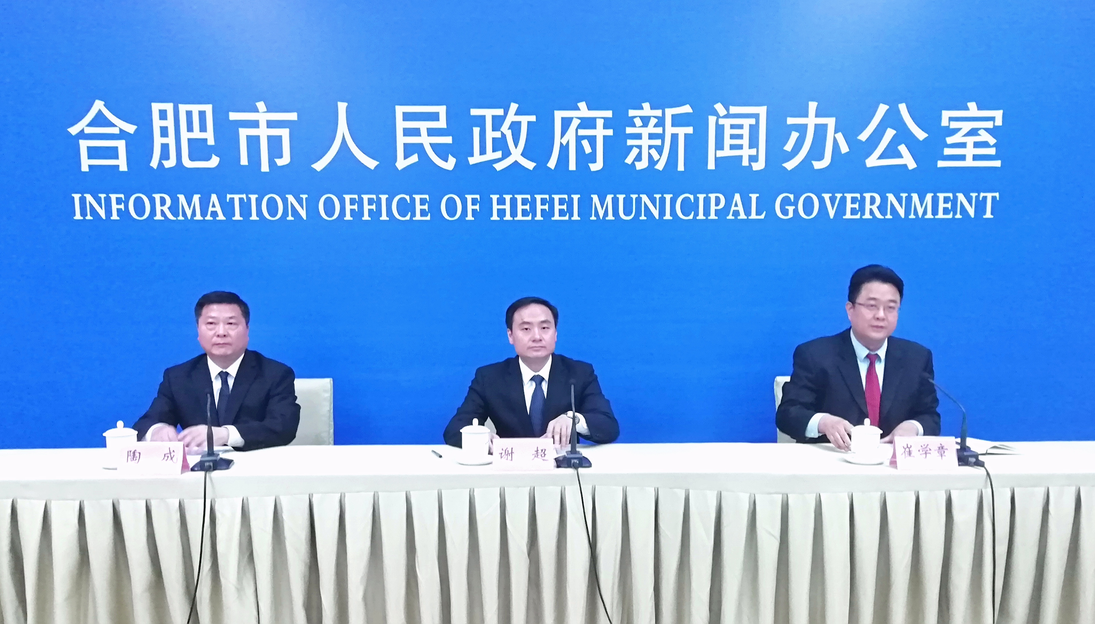《關於進一步吸引優秀人才支持重點產業發展的若干政策(試行)》新聞發佈會現場,左起:合肥市人社局副局長陶成,市委組織部副部長謝超,市委宣傳部副部長崔學章主持發佈會(孫軍/攝)