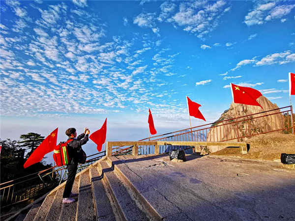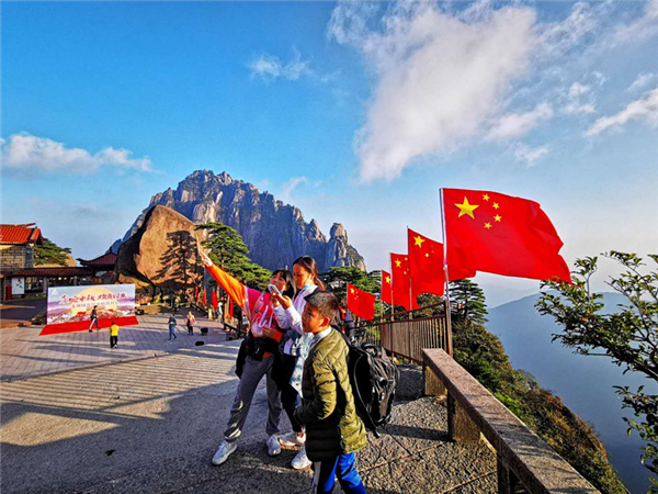 “十一”黃金周首日,黃山風景區天氣晴好,紅旗招展,和風拂面,萬裏晴空一覽無餘。截至中午12時,景區共接待遊客5721人,其中南大門5440人,北大門281人。