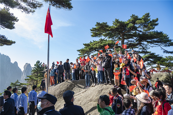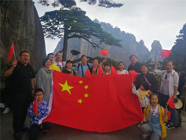 迎客松前,鮮豔的五星紅旗在黃山秋日美景中更加光彩奪目,為秀麗的黃山增添了一抹亮色。在國慶日這個特別的日子裏,遊人們愛國之情、對祖國的自豪感油然而生。現場響起眾多遊客的歡呼聲,大家齊聲祝願祖國繁榮昌盛、國泰民安!更有不少遊客激動地雀躍,眼含淚光。