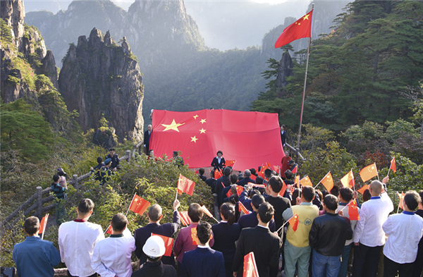 【香港商報網訊】日出東方,國旗飄揚。10月1日清晨,在黃山迎客松、西海廣場、天海片區、雲谷寺、西海觀光纜車等地,來自五湖四海的遊客和黃山風景區工作人員共同舉行升國旗儀式,並載歌載舞,熱烈慶祝中華人民共和國七十一周年華誕。