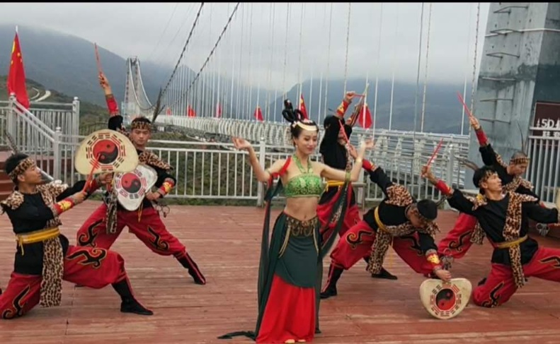 與遊客穿行總長369米的5D玻璃吊橋,80米落差的望而生畏隨之而來。玻璃橋面上傳來的陣陣以聲、光、電等高科技5D手段展現的尖叫刺激,大開「心跳之旅」。好在橋上俯瞰景區,雲中漫步、憑虛御風的仙境感油然而生。駐足橋上專門設立的半圓形觀景台,雲捲雲舒的海拔2700米風景引人入勝、嘆為觀止!