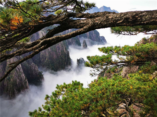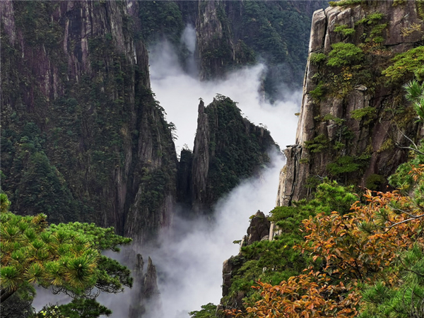 秋雨中的黃山別有另一番韻味,霧氣隨著秋風在山間肆意飄動,給滿山秋色籠上了一層薄薄的面紗,好似一幅中國寫意山水畫。上午8時左右,在黃山蓮花亭附近雲海乍現,白色的雲霧從山谷中緩緩升起,伴著秋風在峰巔舞動,引得遊人駐足觀賞、歡呼雀躍,紛紛拿出手裏記錄這一刻的黃山美景。
