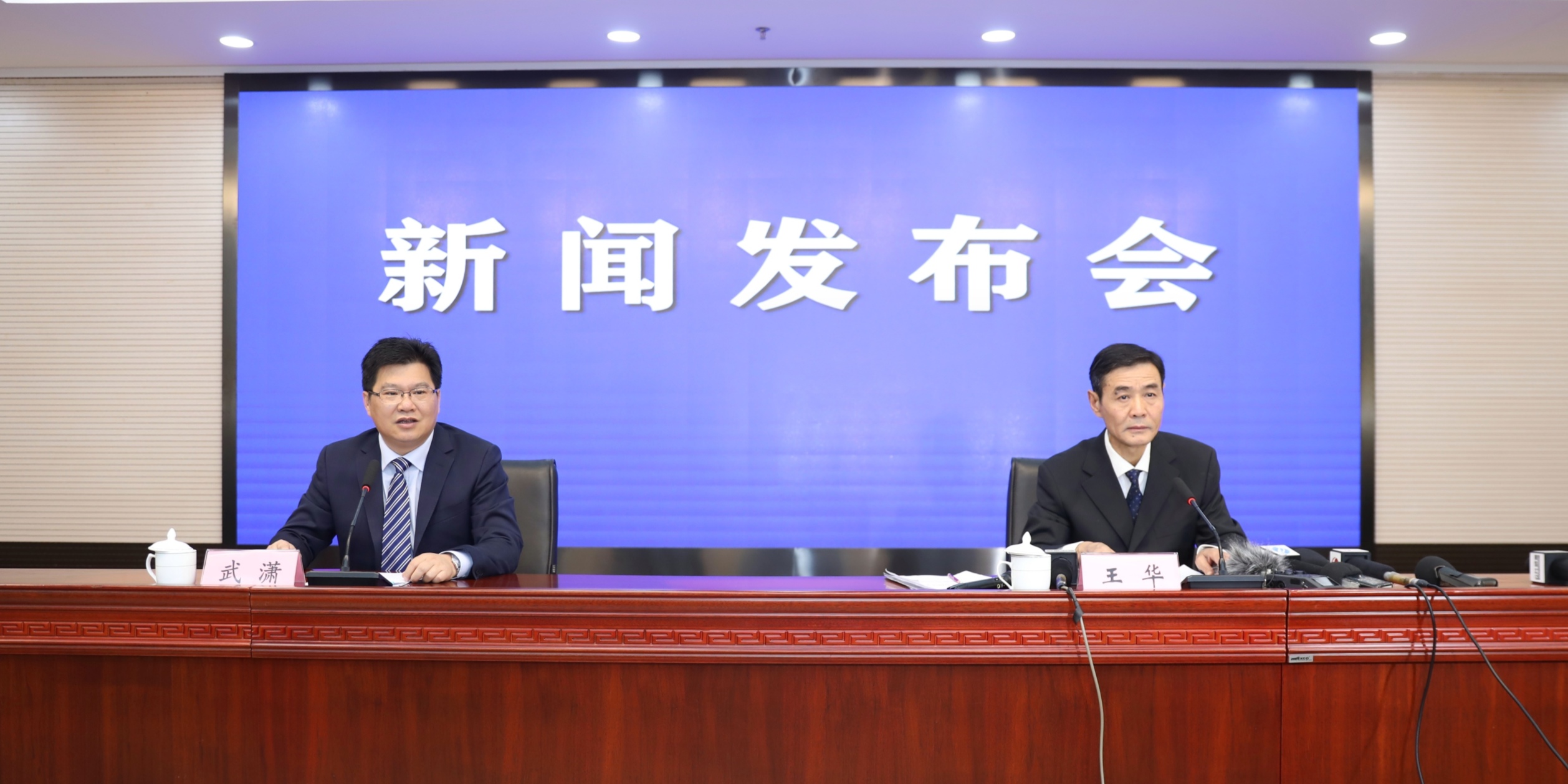 中國安徽名優農產品暨農業產業化交易會(2020 合肥)新聞發佈會現場,安徽省委宣傳部新聞發佈處處長武瀟(左)主持發佈會,省農業農村廳副廳長王華介紹相關情況並回答記者提問(孫軍/攝)