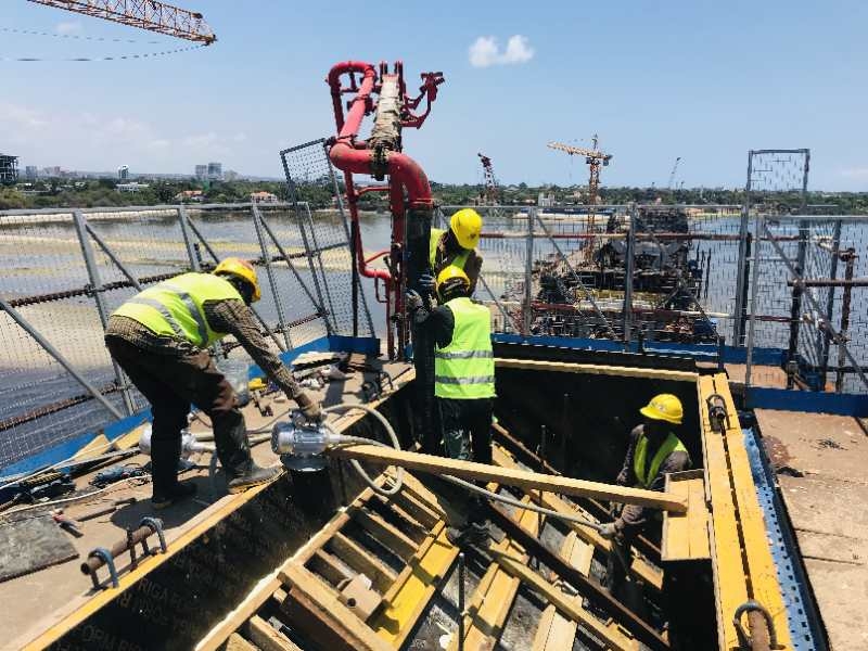 【香港商報網訊】坦桑尼亞時間10月10日15時30分,隨着最後一車混凝土入模,由中鐵大橋局承建的坦桑尼亞新塞蘭德跨海大橋P5主墩塔順利封頂,至此P5主墩混凝土主梁進入快速懸澆施工階段。