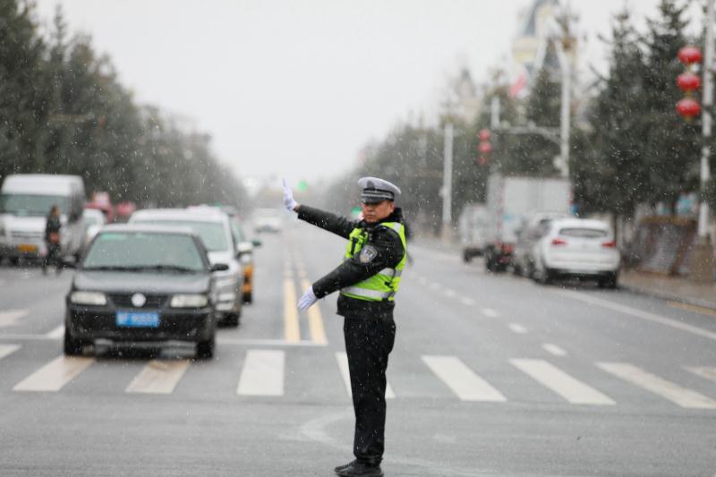 由於降雪導致道路濕滑,能見度低,部分路面出現結冰,漠河市交通警察大隊及時組織警力上路疏導交通,提醒車輛和行人減速慢行。