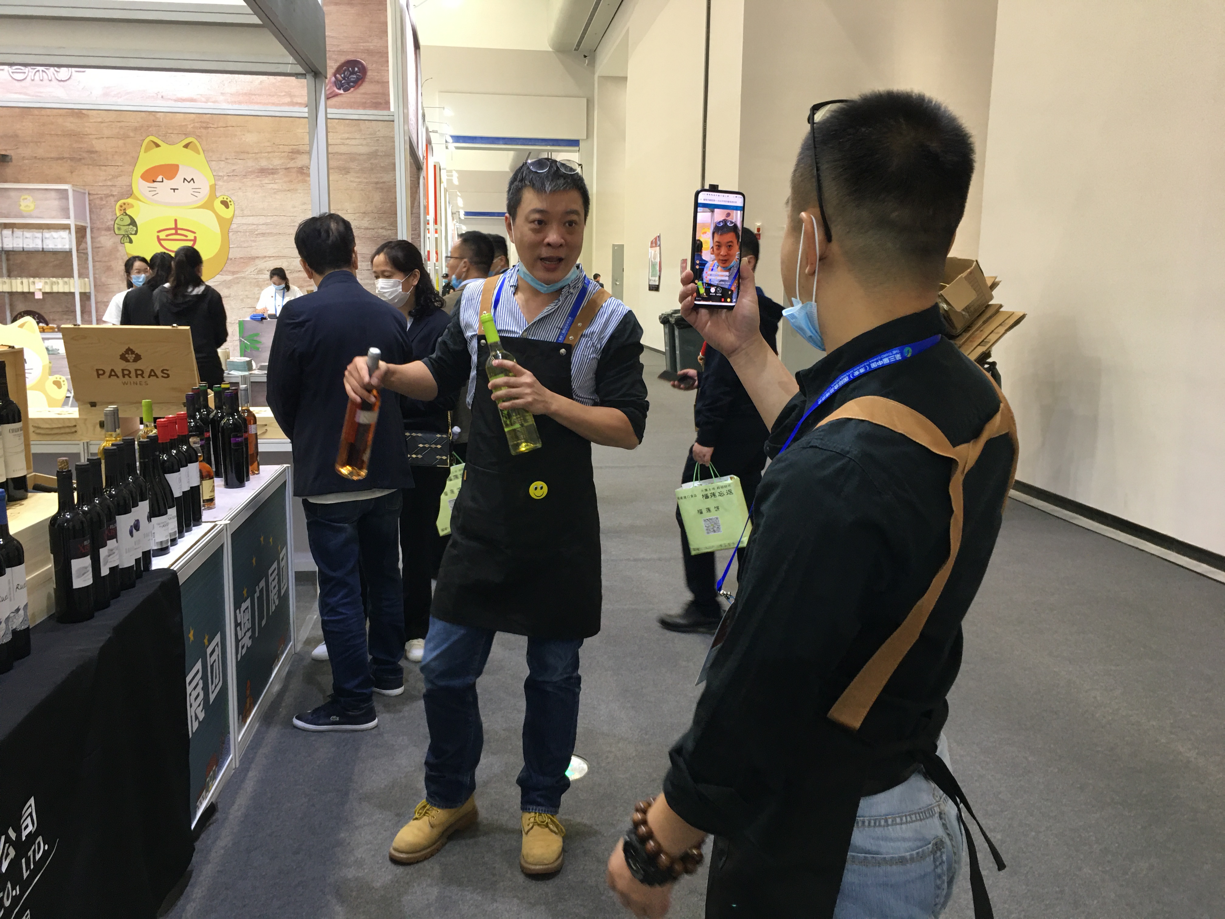 在新冠肺炎疫情持續全球蔓延的背景下,本屆食博會未見本港展商身影。而已經與內地重開通關的澳門則有部分展商首次來到淮安參展。在境外食品館展會現場,澳門展團吸引眾多觀眾駐足,展商不僅帶來經澳門銷售的海外眾多紅葡萄酒、白葡萄酒、榴槤餅、朱古力威化等產品,還有獨具澳門本地特色的肉脯產品,有人亦積極吸收內地「網紅」經濟特色,做起了網絡直播銷售。