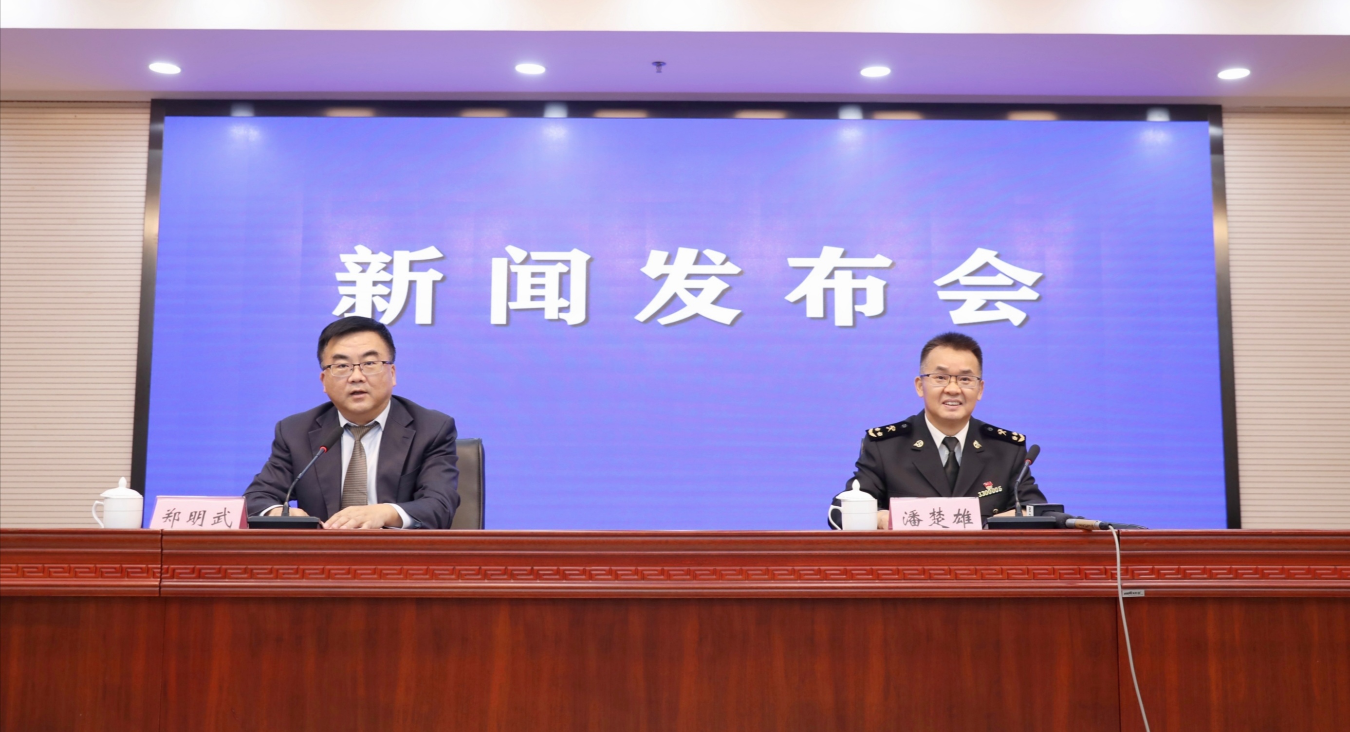 2020年前三季度安徽外貿進出口情況新聞發佈會現場,安徽省委宣傳部副部長、省政府新聞辦公室主任鄭明武(左)主持發佈會,合肥海關副關長潘楚雄介紹相關情況(孫軍/攝)