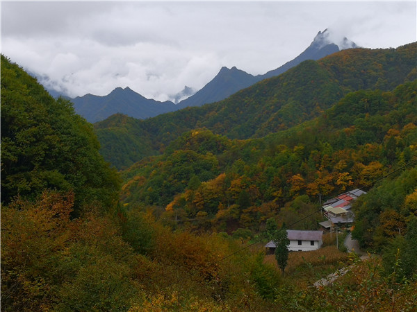 青山、薄霧、彩葉、農舍構成城口鄉村風景畫
