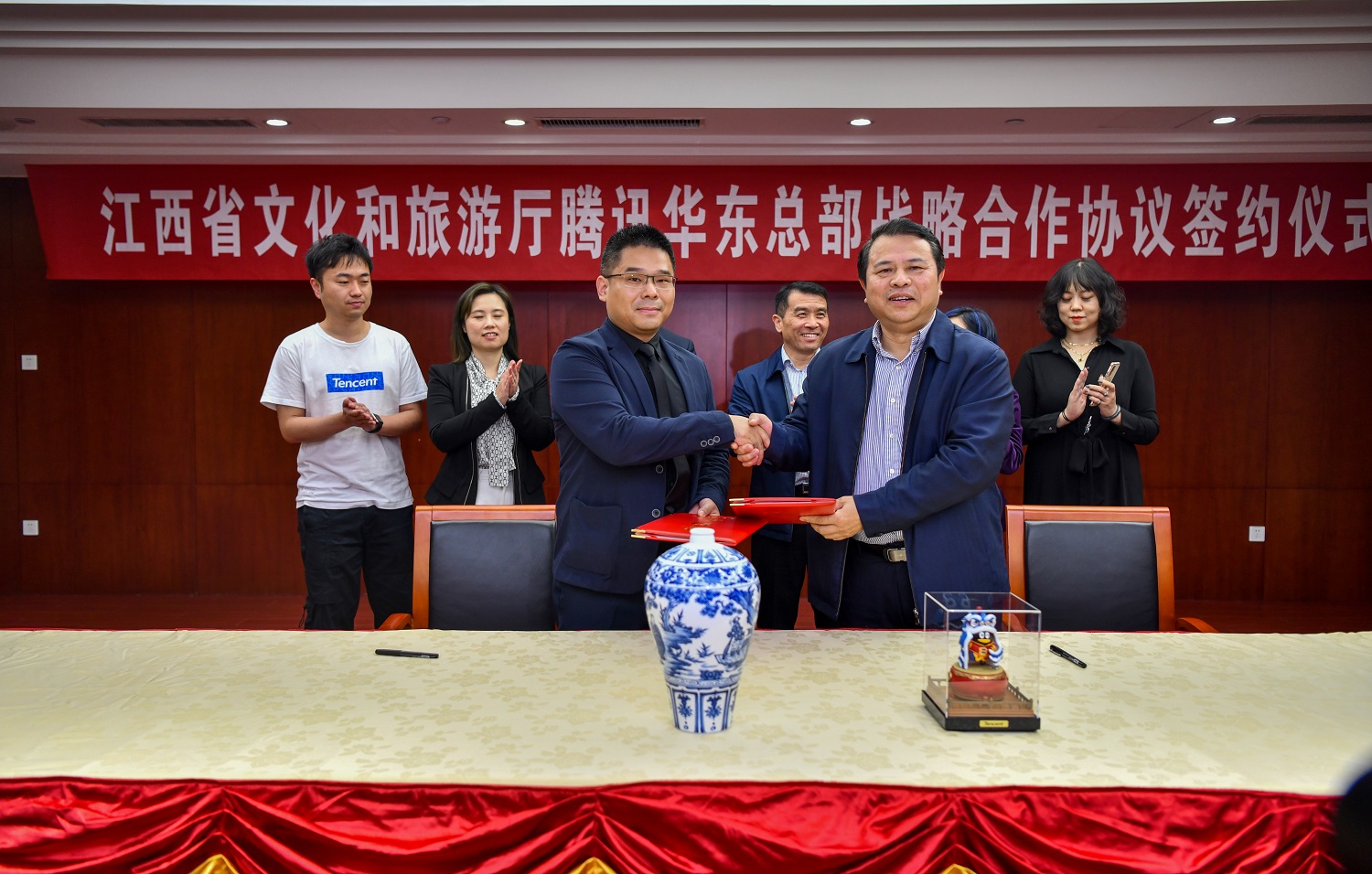 江西省文資辦主任王成饒,江西省文化和旅遊廳黨組成員、副廳長陳曉平,江西省文化和旅遊廳黨組成員、副廳長郞道先,騰訊副總裁、華東總部總經理張立軍,騰訊華東總部黨總支書記、政府事務高級總監朱潔,騰訊華東總部政府事務總監丁佳,騰訊文旅總經理鈕迅,騰訊企業產品部高級解決方案架構師李濤,騰訊文旅華東商務總經理邵菲出席簽約儀式。會上,陳曉平和鈕迅代表雙方簽訂戰略合作協議。