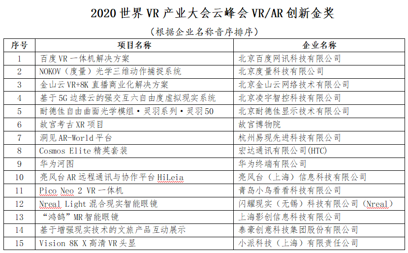 10月19日,2020世界VR產業大會雲峰會VR/AR創新獎正式發佈。本次活動共有15項成果獲得2020世界VR產業大會雲峰會VR/AR創新金獎、47項成果獲得VR/AR創新獎。