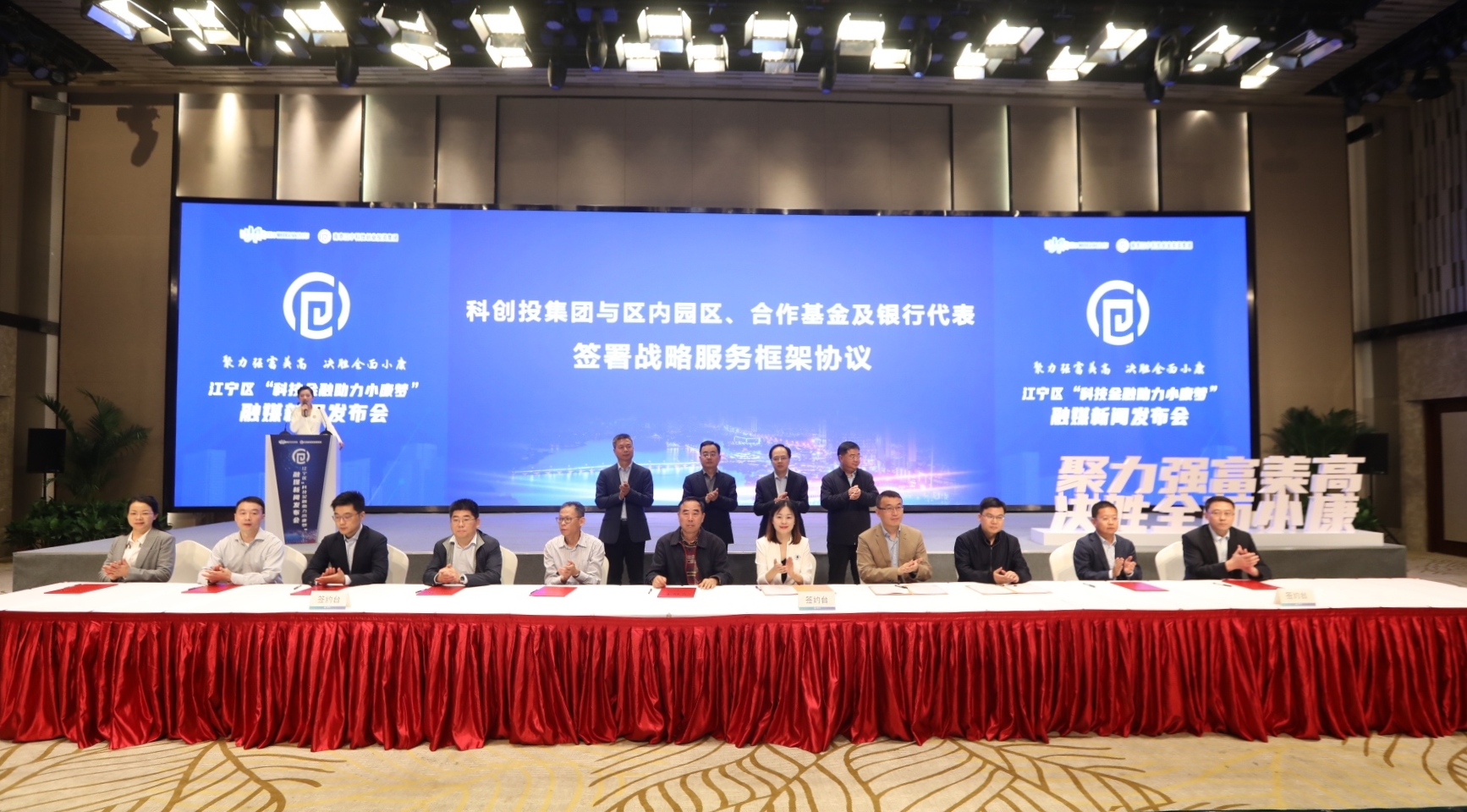 「聚力強富美高 決勝全面小康」融媒新聞發佈會在南京江寧區舉辦。江寧科創投集團與江寧區10個街道、5家園區、3支基金、2家銀行和11家區屬國企集團簽署戰略服務框架協議。