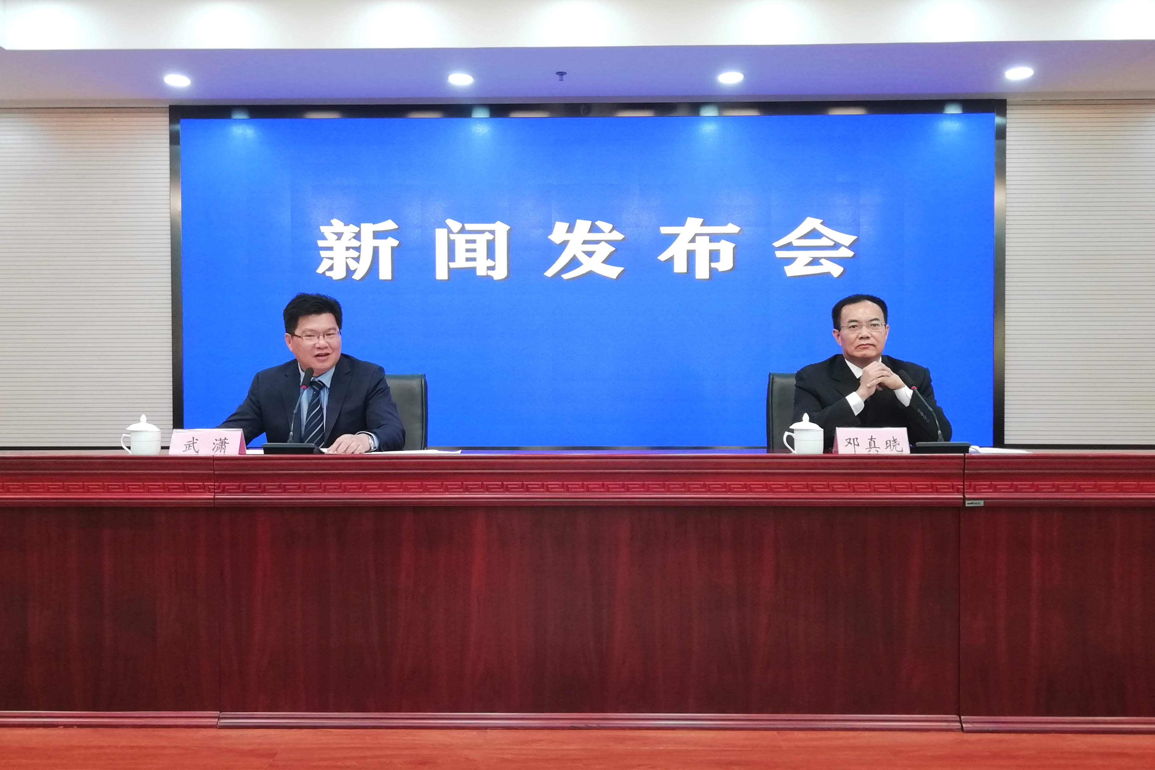 第五屆安徽省民間雜技藝術節新聞發佈會現場,安徽省委宣傳部新聞發佈處處長武瀟(左)主持發佈會,阜陽市委常委、臨泉縣委書記鄧真曉介紹相關情況(孫軍/攝)