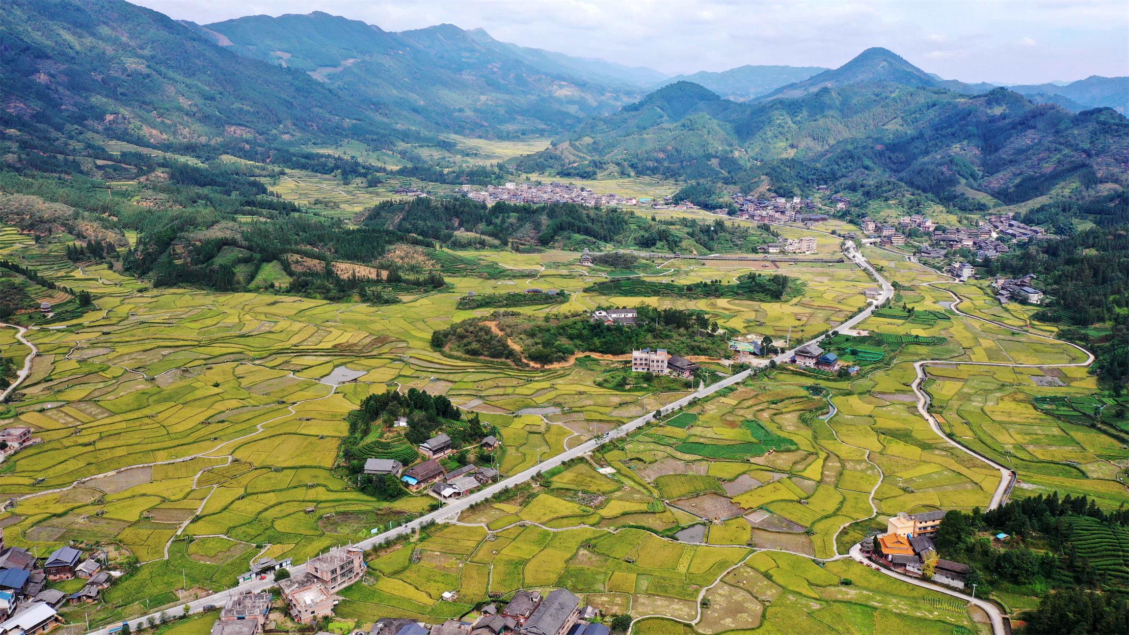 無人機航拍的三江侗族自治縣良口鄉南寨村與和里村豐收景象