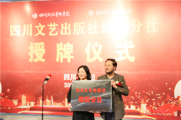 儀式上,四川文藝出版社總編輯張慶寧代表四川文藝出版社,為四川文藝出版社綿陽分社授予了牌匾並頒發了授權證書。(張寶杉)