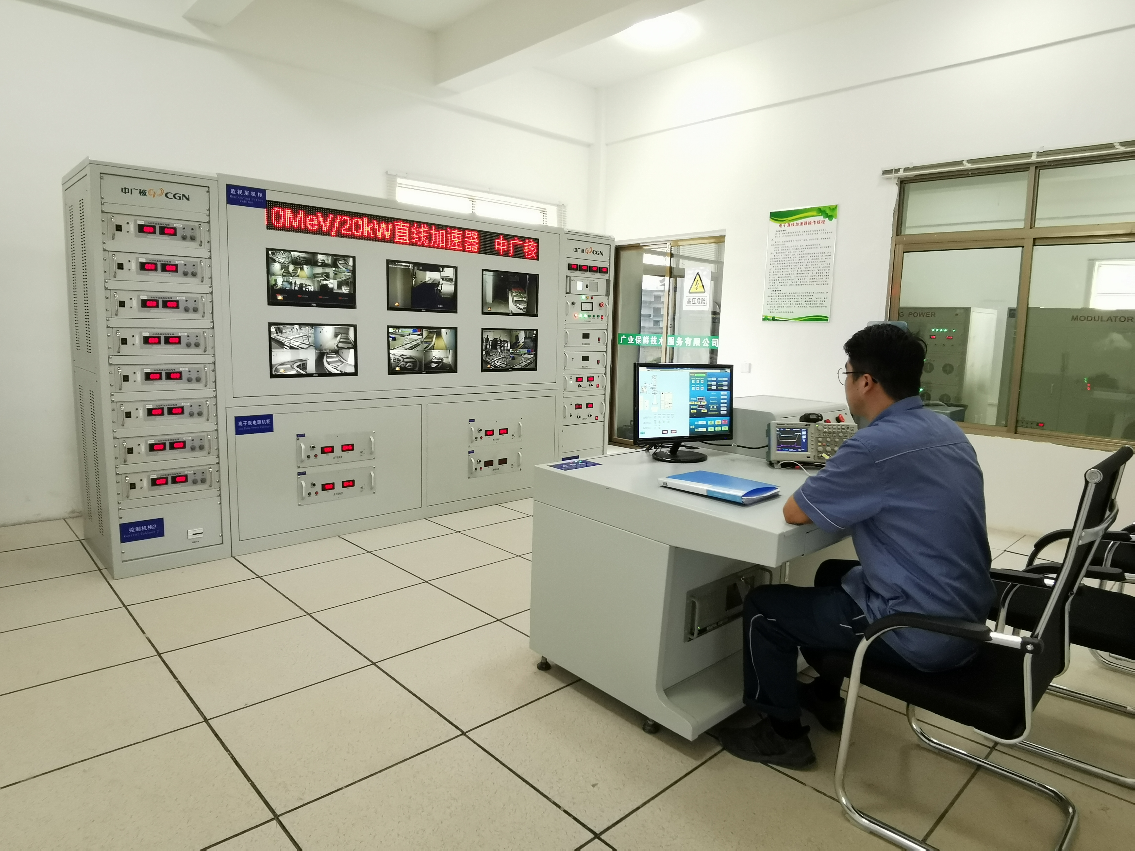 技術人員在項目主控室內操作電子直線加速器運行。