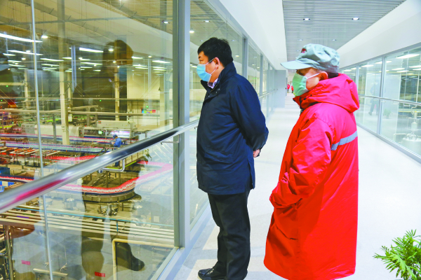臨江市委書記欒國華(左)到農夫山泉臨江長白山飲用水有限公司調研。