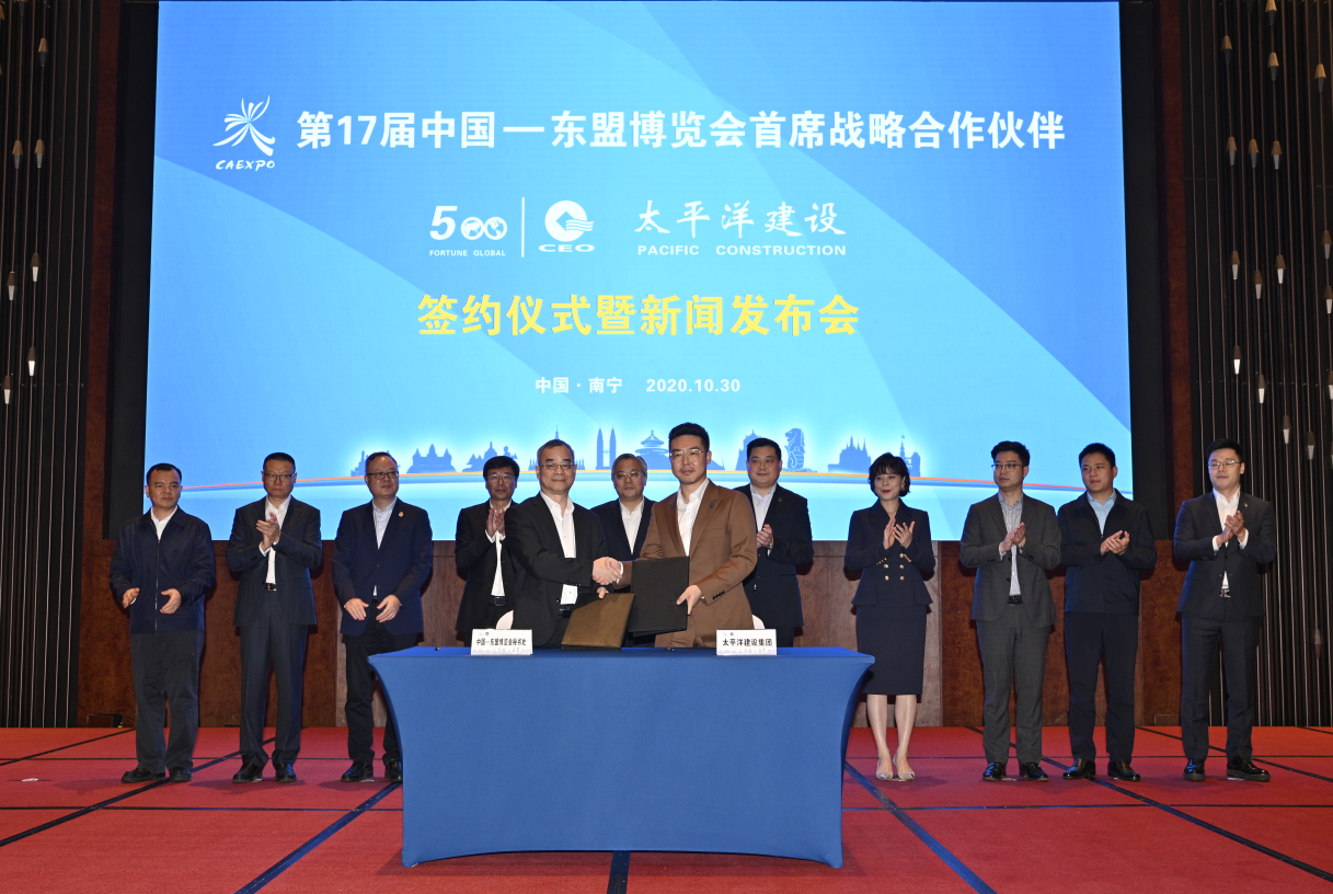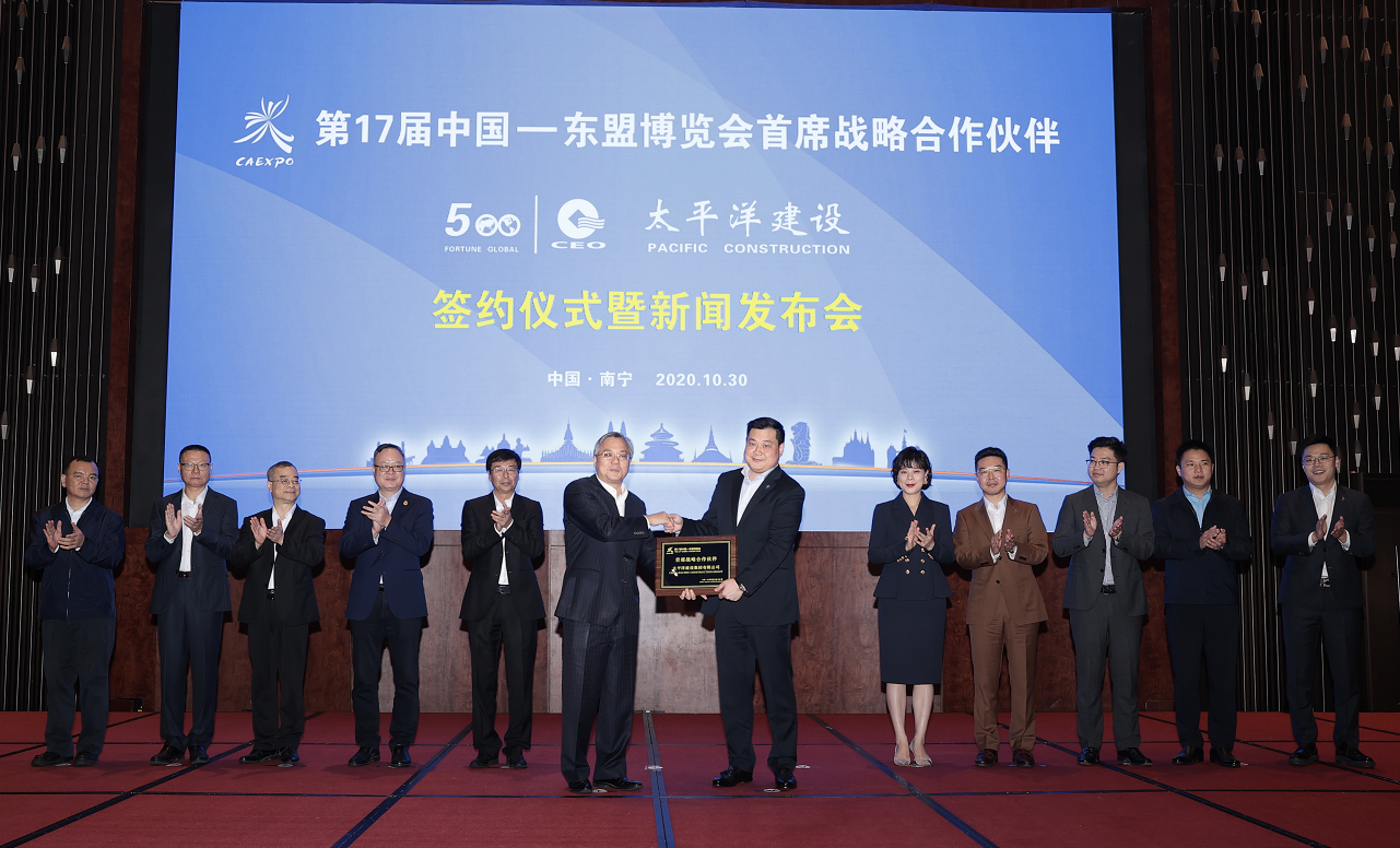 10月30日,記者從第17屆中國—東盟博覽會首席戰略合作夥伴簽約儀式暨新聞發佈會上獲悉,世界500強企業太平洋建設集團與中國—東盟博覽會三度攜手,榮膺第17屆東博會首席戰略合作夥伴。廣西壯族自治區副主席周紅波出席簽約儀式,向太平洋建設集團董事局主席嚴昊頒發「第17屆中國—東盟博覽會首席戰略合作夥伴」榮譽牌匾並見證簽約。