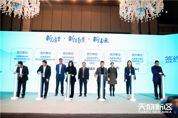 在簽約儀式上,總部經濟局與成都市樓宇經濟促進會簽署全面合作協議。成都天投資產管理有限公司與蔚來汽車達成意向合作;蔚藍卡地亞花園城與方所簽署戰略合作協議;新疆廣匯與四川文軒軒客會文化發展有限公司簽署戰略合作協議;同森集團與美豪酒店、保利嘉萊影院簽署戰略合作協議;萬華集團與漁盼、子非簽署戰略合作協議。這些知名品牌的到來,將給天府新區的商業注入新的活力。