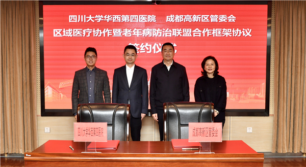 11月4日,成都高新區與四川大學華西第四醫院舉辦區域醫療協作暨老年病防治聯盟合作簽約儀式,雙方將通過建立以家庭醫生團隊服務為載體,以雙向轉診、專科聯盟和互聯網醫院為主要建設內容的特色老年病防治聯盟,為區域群眾帶來更優質的健康醫療服務。