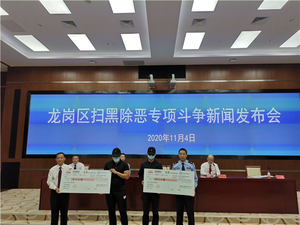 發佈會首先舉行舉報獎勵發放儀式,兌現舉報線索查實有獎的承諾,為兩名舉報人發放獎勵金5萬元。截至目前,龍崗區已舉行舉報獎勵發放儀式5次,累計獎勵舉報人 19人,獎勵金額達33.9萬元。