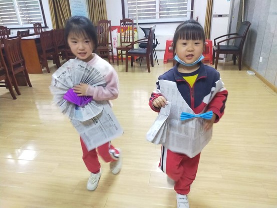 活動中,志願者給大家分發舊報紙,講解製作中注意的細節。經過一個多小時的創作,孩子手中的舊報紙變成了大家的手中變成了各色的時尚服裝,各具特色。他們穿着自己製作的個性服裝,臉上露出自信的笑容,在舞台上閃亮登場,足足過了一把時裝癮。