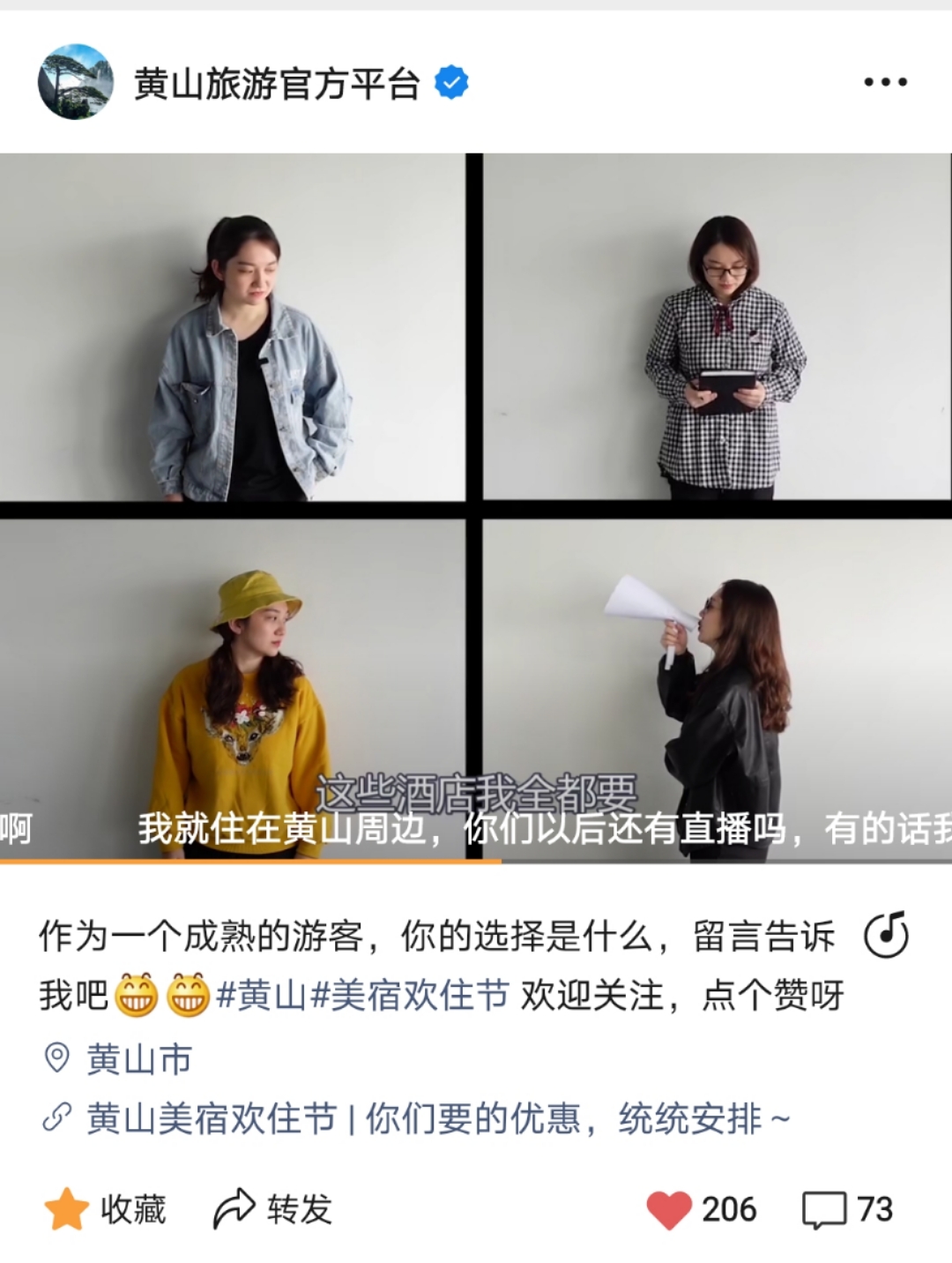 堅持市場化選品。此次直播的產品對接方面,共接觸商家36戶,收集有意願商家資料23家,最終篩選上線18家,包括黃山昱城皇冠假日酒店、黃山湯泉大酒店等星級酒店以及齊象書局、微印巷主題客棧等網紅民宿,而黃山燒餅,徽州臭鱖魚等爆款特產也為此次直播加入了徽州美食文化元素,從而更好地吸引遊客關注。